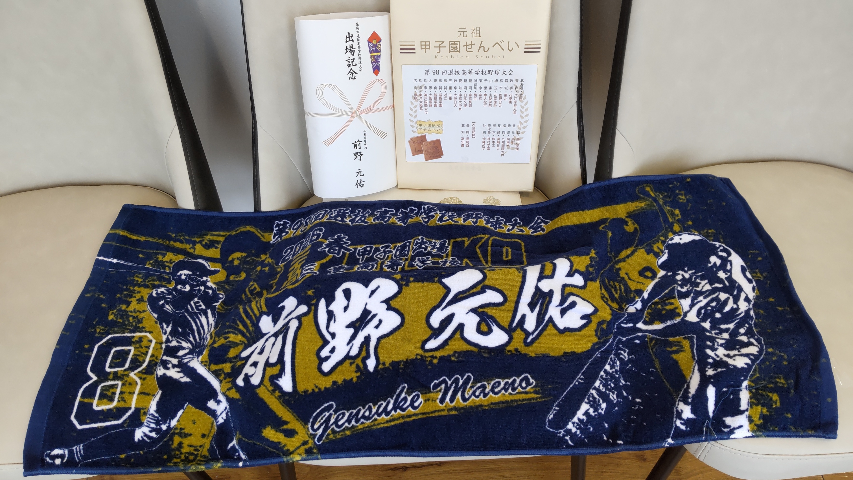 絶対美味しいお煎餅と、息子さんの名前の入ったタオルです